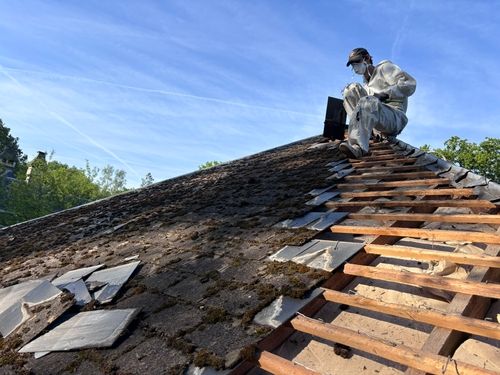 Recent hebben we een volledig asbestdak vervangen op een karakteristiek hellend dak van een woning. Het betrof een oppervlakte van ongeveer 100 m², bedekt met verouderde asbesthoudende leien die toe waren aan veilige en verantwoorde vervanging. Onze werkzaamheden omvatten het zorgvuldig en volgens de regelgeving verwijderen van de asbestleien, uitgevoerd door gecertificeerde professionals in beschermende kleding. Vervolgens hebben we het bestaande dakbeschot volledig vernieuwd en voorbereid op de installatie van een nieuwe dakbedekking. Daarbij is gekozen voor duurzame en onderhoudsvriendelijke materialen met een lange levensduur en verbeterde isolatiewaarden. Dankzij onze doordachte aanpak en oog voor detail heeft dit project geresulteerd in een veilig, modern en visueel aantrekkelijk nieuw dak – volledig vrij van asbest en klaar voor de toekomst.