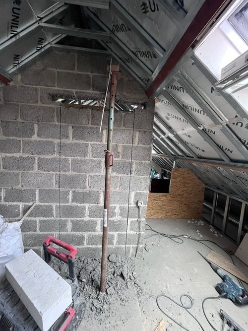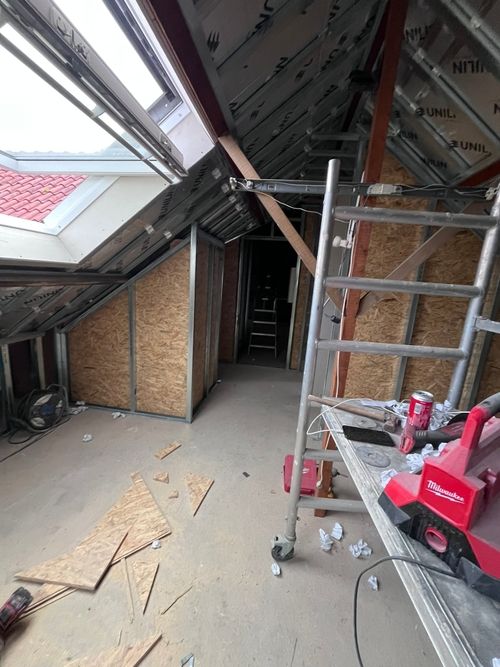 In Zwijnaarde zijn we gestart met een grondige isolatie-upgrade van de zolderverdieping van een klassieke woning. Om het comfort en de energie-efficiëntie aanzienlijk te verbeteren, werd gekozen voor hoogwaardige Unilin PIR-isolatiepanelen, die niet alleen uitstekende thermische prestaties leveren, maar ook ruimtebesparend zijn dankzij hun slanke profiel. De bestaande houten dakstructuur werd versterkt en voorzien van een nieuwe onderstructuur uit metaalprofielen en OSB-platen. Het project omvatte eveneens het integreren van dakramen om natuurlijke lichtinval te garanderen. Deze voorbereiding vormt de basis voor verdere afwerking van de zolder tot leefbare ruimte.